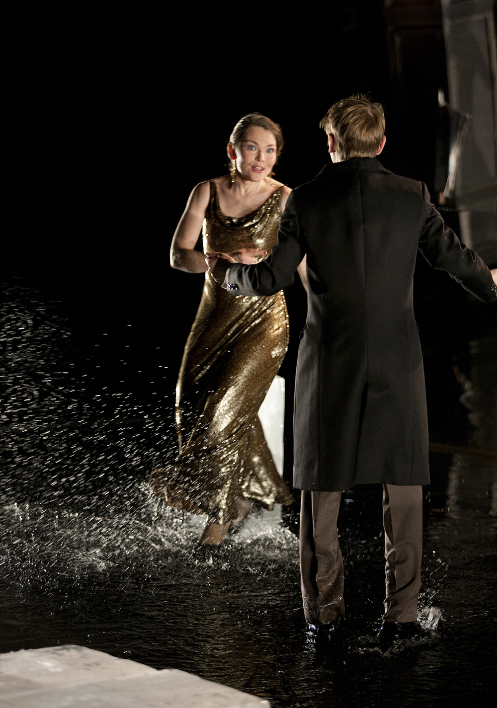Eugene Ionesco’s The Bald Soprano is a classic of absurd theatre. The play depicts the emptiness of petty, English bourgeois life, where human interaction consists of idle phrases. The visuals of the play toyed with, among other things, the duplicity characteristics of the hosting couple. The costume design was technically rather challenging, requiring development of hidden water- and coldproof undergarments due to extensive use of ice and water on stage and considering the requirements of fire safety on all costume choices.
